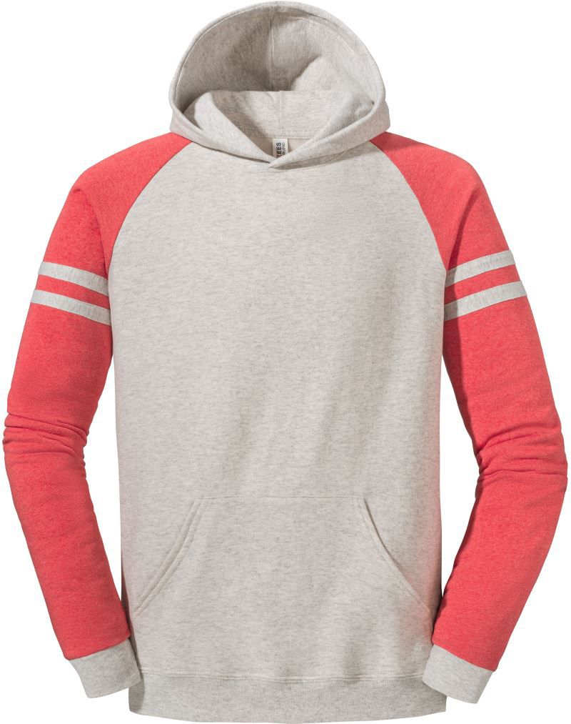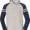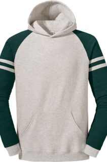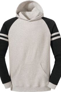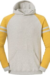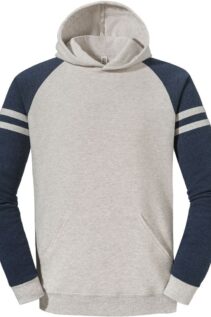 Der Jerzees NuBlend Varsity Kapuzen Sweater kombiniert sportliches Design mit hoher Qualität und angenehmem Tragekomfort. Die kontrastfarbenen Raglanärmel mit Streifen verleihen dem Hoodie einen markanten Varsity-Look, der sich ideal für Freizeit, Teams oder Vereine eignet.